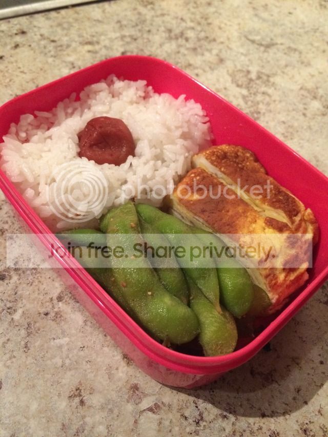 Rice with umeboshi, rolled egg omelette, and seasoned edamame (seeing more of these in the freezer section of regular grocery stores these days).