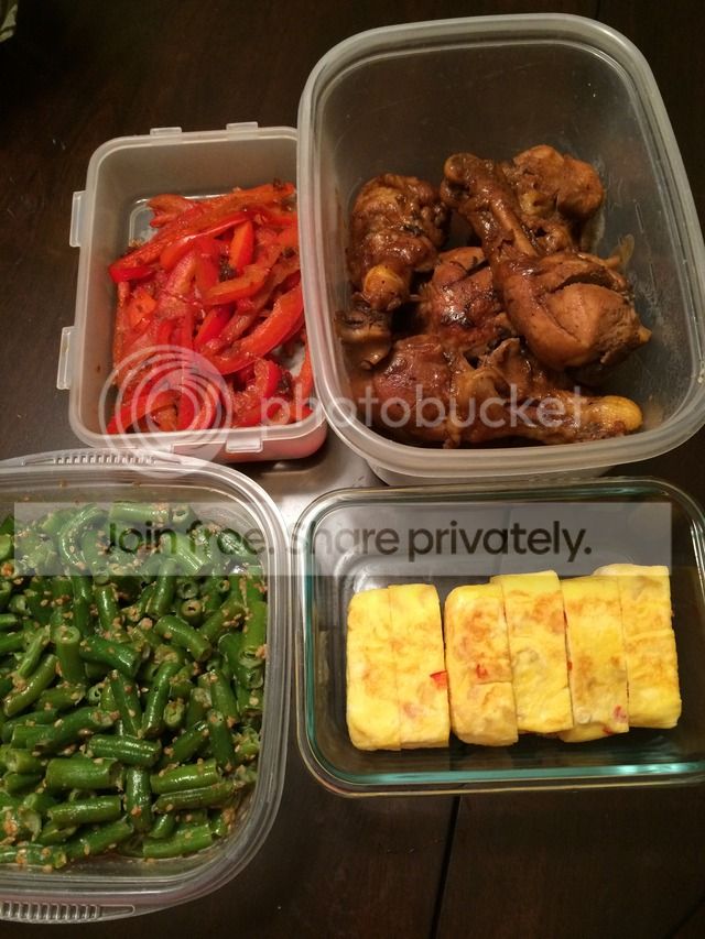 Bellpepper stirfry with bonito shavings, sesame seasoned green beans, chicken adobo drumsticks, and egg omelette.