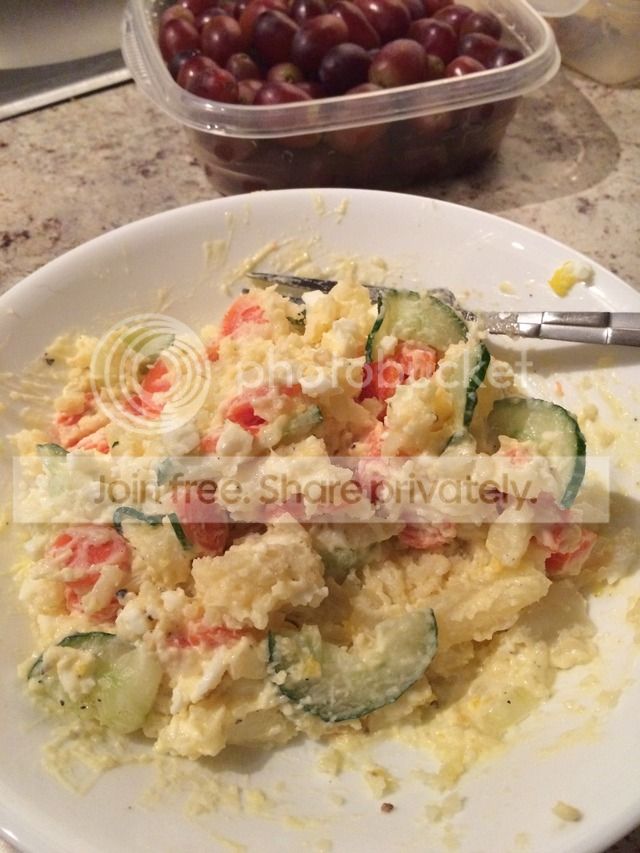 - Mash the potatoes lightly (I mash my egg too, but you can slice it into little bites) and add the cucumber, onion, a dash of vinegar, and as much mayo as you prefer.